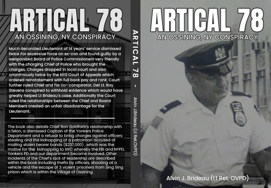 Alvin Brideau was the seventh child of twelve born to Howard and Alice Brideau on August 20th, 1938 in Tarrytown, NY. He attended St Teresa’s Elementary school in North Tarrytown (Now known as Sleepy Hollow, NY). Upon Graduating NTHS in 1957 he attended Westchester Community College the Mercy College. Following working several different jobs he took the police and firemen’s test passing both and when given a chance to become a police officer with the Ossining Village Department he did so February 9th, 1967. While employed there he served as Vice President of the Ossining Police Association and then became President. He became Sergeant in 1973 and then Lieutenant in 1976. During 2019 he began to write about his experiences as a Police Officer in Ossining, NY and became a victim of a conspiracy within the department.
